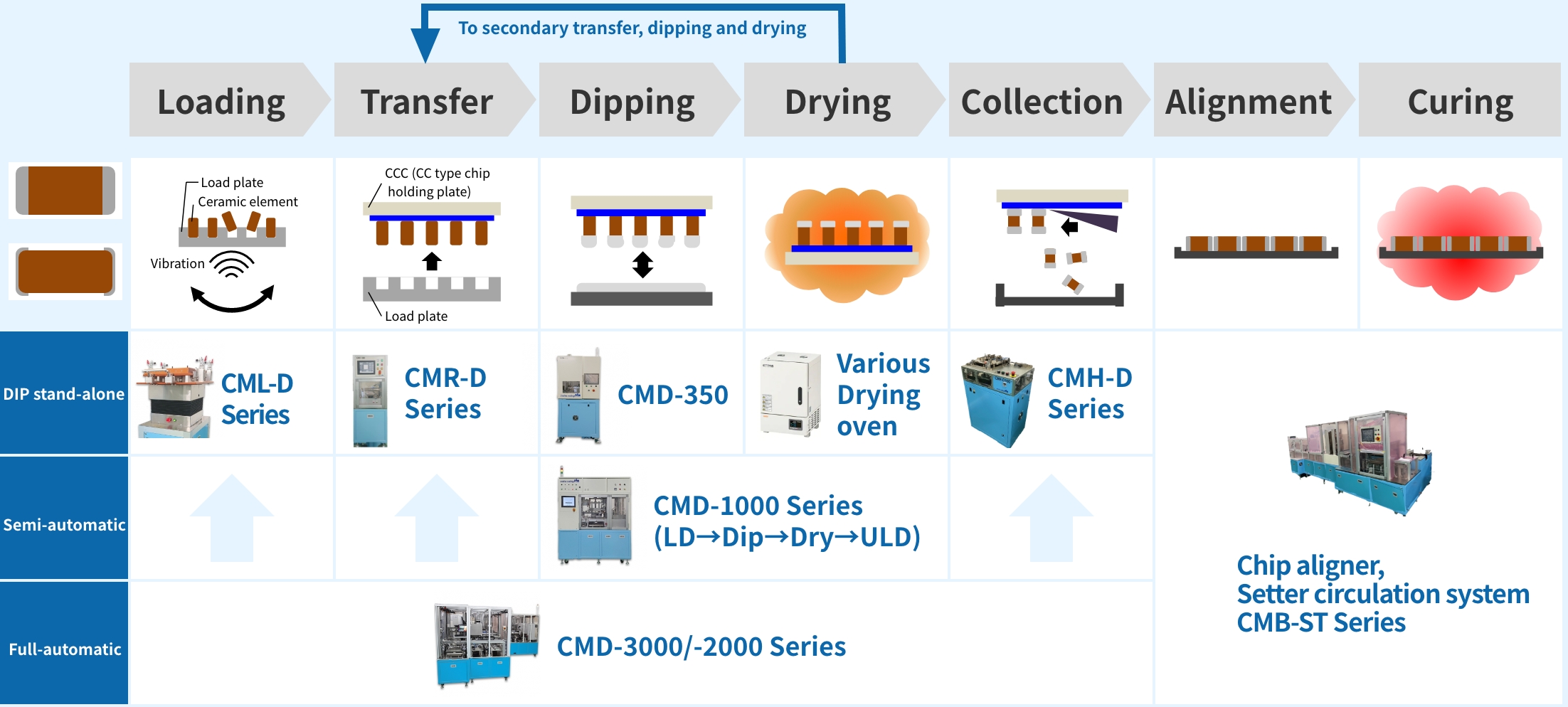 We provide process technologies, equipment, jigs, and contract services related to the forming of next-generation dielectric sheets, internal electrode processes, and external electrode coating (for both two-terminal and multi-terminal types) for passive components such as MLCCs, MLCIs, varistors, and thermistors. Our patented technologies and unique process solutions—supporting products as small as 0201mm—are designed to meet the diverse needs of our customers.